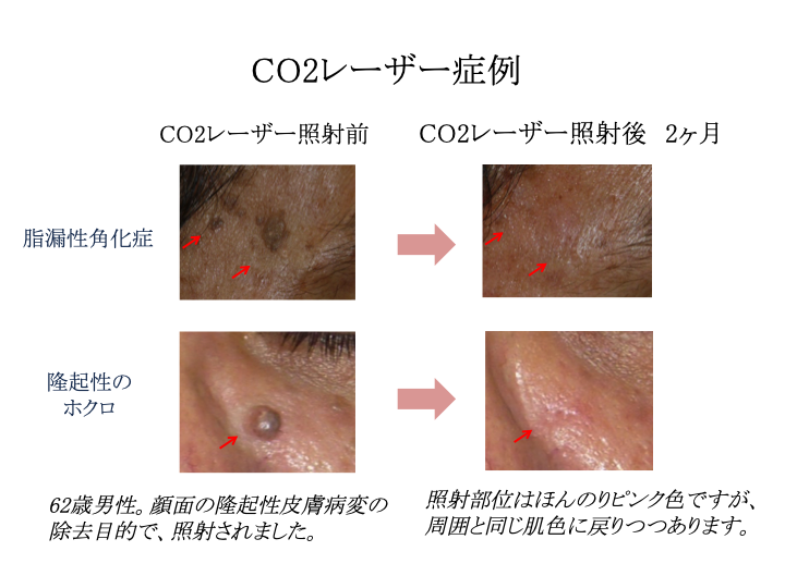 CO2レーザーは、レーザー光が皮膚組織内の水分に吸収され熱エネルギーに変換します。その熱エネルギーが皮膚組織を蒸散・凝固壊死させることにより、ほくろやいぼや皮膚腫瘍(できもの)などの腫瘍を切除することが出来ます。大きいものや深いものは局所麻酔を行います。切除後、軟膏やテープによる処置が最低1ヶ月は必要です。母斑細胞のある深さによっては再発することもあります。