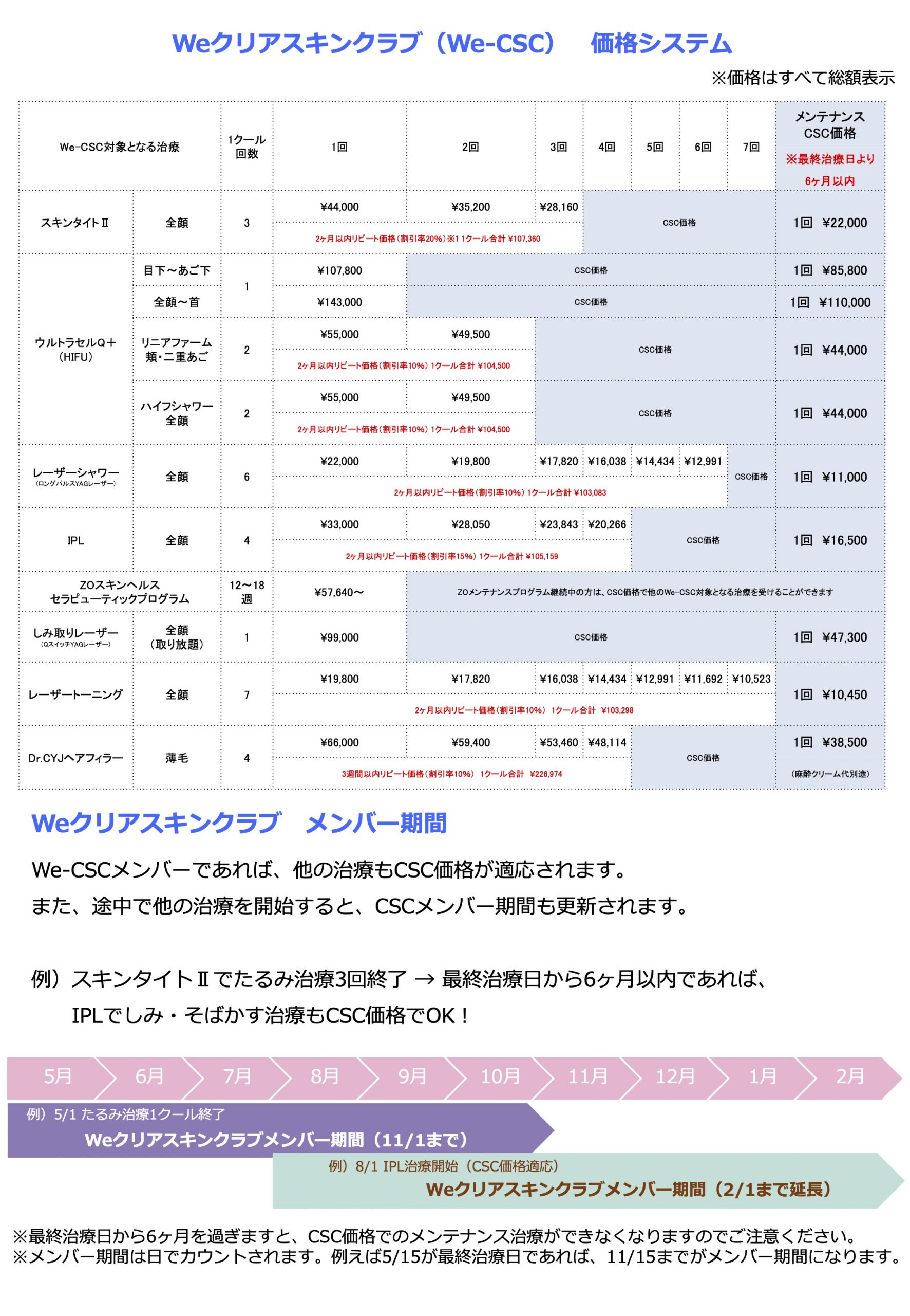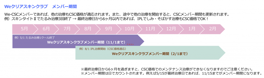 治療を1クール終えられた方はWe-CSCメンバーとなり、CSC価格でメンテナンス治療を受けることができます。We-CSCメンバー期間は、治療最終日から6ヶ月間とします。治療最終日から6ヶ月以内であれば、CSC価格でメンテナンス治療を受けることができます。 また、We-CSCメンバーであれば、他の治療もCSC価格が適応されます。