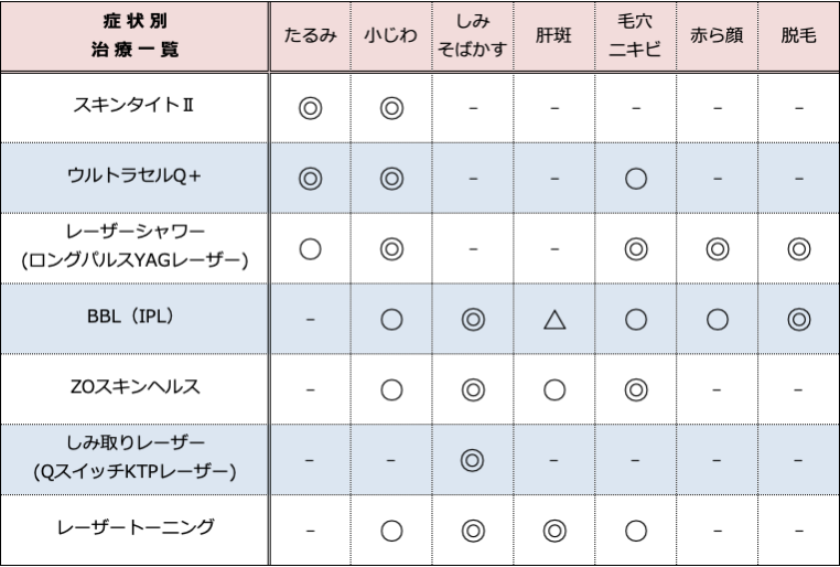 ハリを出したい、たるみが気になる方 → ウルトラセルQ+/スキンタイトⅡ/レーザーシャワー(ロングパルスYAGレーザー)
