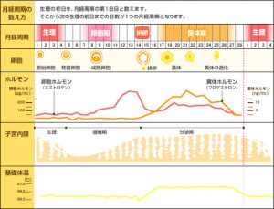 月経の初日を「月経周期の1日目」と数えます。そこから次の月経の前日までの日数を「月経周期」といいます。